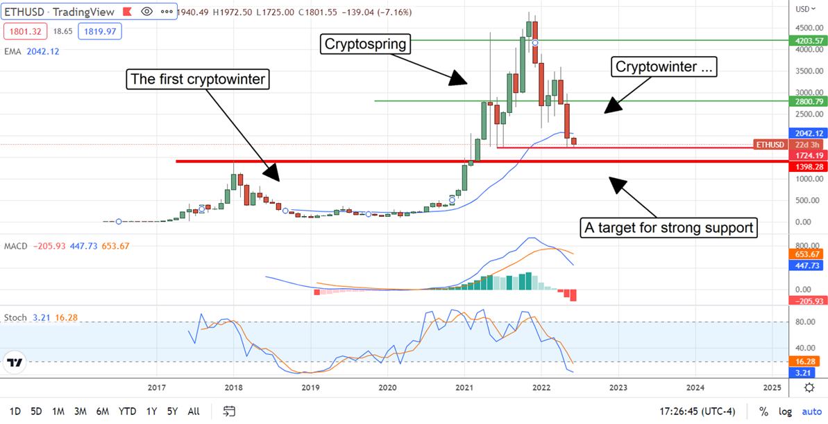 The market is sitting on a pretty firm support target now and that is still above the key support target near $1420. The $1420 target is coincident with the previous all-time high and should provide a solid bounce, if not a reversal, and it is only 70% below the recent highs. The last Cryptospring delivered a return of 4700%.